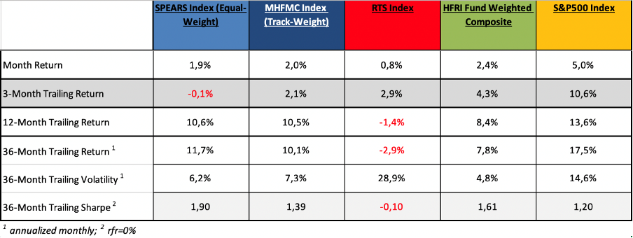 SPEARS Hedge Fund Index (Equal-Weight) завершил квартал практически на нуле (-0,1%), тогда как MHFMC Hedge Fund Index (Track-Weight) прибавил 2,1%. Это указывает на то, что более зрелые фонды в целом превзошли молодые по результативности за отчётный период. Лучший результат в этом квартале был у глобального HFRI Fund-Weighted Composite Index, который показал доходность в 4,3%.